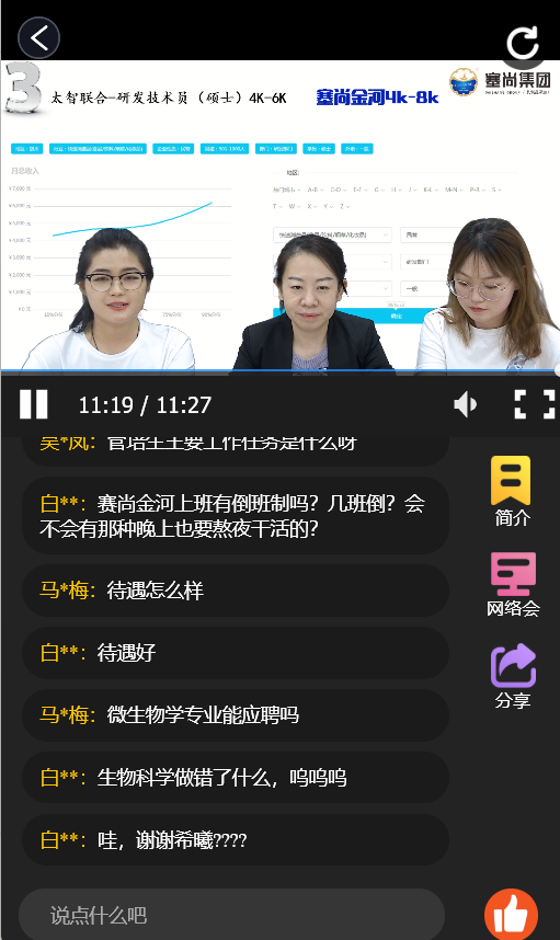 毕业生围观,先后有204人线上求职,投递简历277份,线上完成303次面试,有31人与用人单位达成求职意向。直播结束后,毕业生可继续利用猫头英云人才市场线上求职、投递简历,与用人单位“屏对屏”的进行双选洽谈,推进就业服务工作。