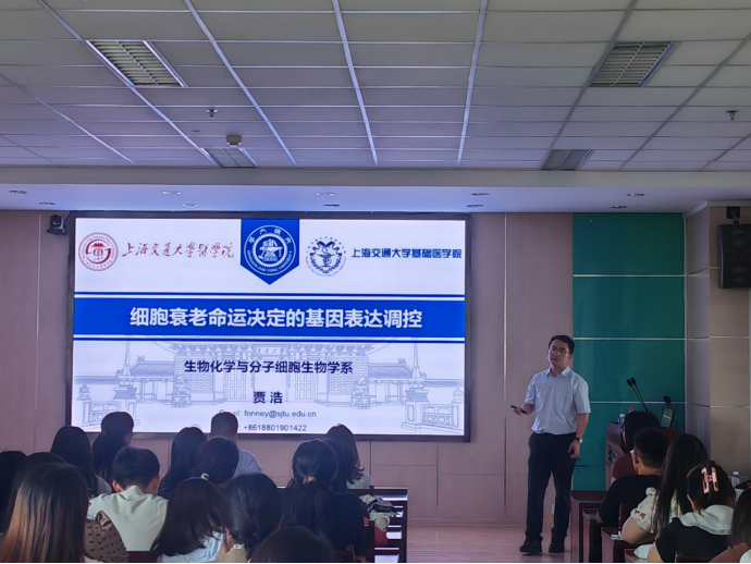 副研究员贾浩为教师和学生代表作了题为“细胞衰老命运决定的基因表达调控”的学术报告。报告深入浅出、紧扣学科发展前沿,开阔了师生的学术视野,使师生对相关领域有了更深刻全面的认识,赢得了与会青年教师及研究生的一致好评。