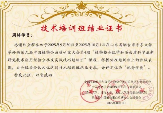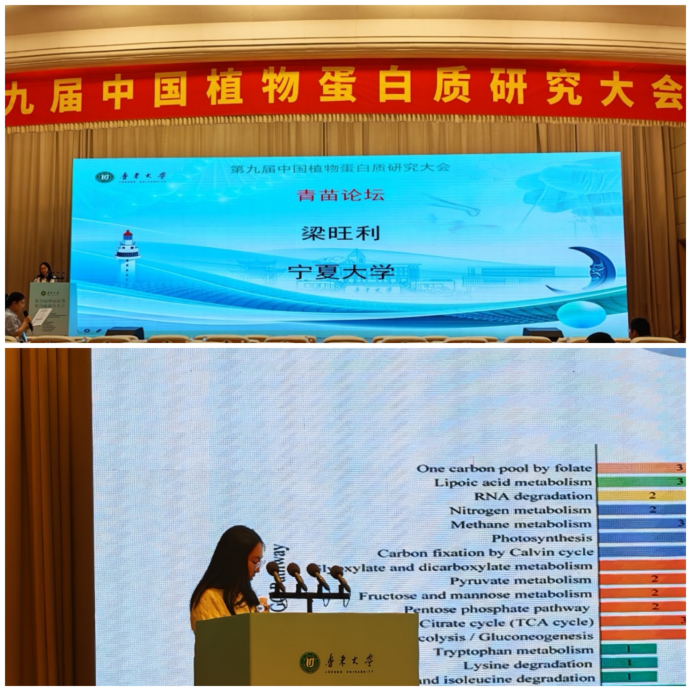 会议期间,团队成员积极参与学术报告、墙报展示与技术培训,认真聆听了多位顶尖学者的精彩报告,这些报告不仅涵盖了植物蛋白质研究领域的最新动态和前沿技术,还提供了交流和学习的宝贵机会。博士生梁旺利在“青苗论坛”作题为《蛋白质乙酰化和琥珀酰化修饰揭示宁夏枸杞耐盐调控途径研究》的口头报告,系统介绍蛋白质酰化修饰在宁夏枸杞响应盐胁迫中的调控机制及关键蛋白功能初探,引发同行关注与深入讨论。多名同学通过墙报展示研究成果,内容详实、设计新颖,充分展现了团队科研风貌。此外,部分成员参加了“植物整合组学与蛋白质科学前沿技术”培训班,进一步提升了他们对前沿方法学的理解与实际应用能力。