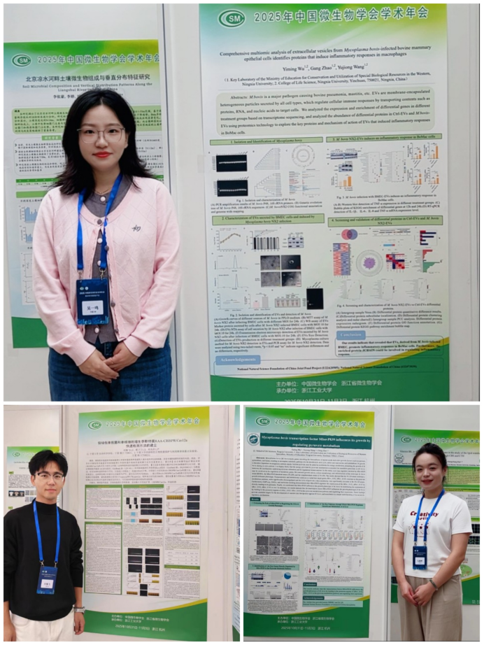 在为期三天的会议里,大咖云集,内容精彩纷呈。团队成员认真聆听众多学术巨擘带来的前沿学术报告,汲取最新研究成果和创新理念。会议设置多个分会场,涵盖微生物学的各个研究方向,为大家提供深入交流和探讨的空间。此外,年会还安排了丰富的墙报展示环节,展示微生物领域的最新科研进展和创新成果,团队成员在墙报展示环节积极交流,碰撞思想的火花。博士生蔡卫卫作为“病原微生物与健康”分会场的唯一一名在读博士研究生作题为《Metagenomic analysis of antibiotic resistance genes in the wastewater treatment system of Yinchuan City: The prevalence and spread of these genes in water and the mouse gut microbiota》的口头汇报,系统介绍了在“全健康(One Health)”理念框架下,本团队基于宏基因组检测技术的宁夏银川市污水系统中病原微生物与耐药基因分布与传播机制的研究进展,引发多位同行的关注与热烈讨论。团队其他参会成员也积极通过墙报交流展示了相关研究成果,不少参会者被团队的研究成果所吸引,驻足交流。