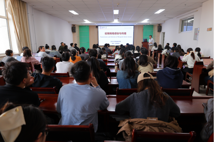 当日下午,程功教授为全院师生带来了题为《蚊媒病毒感染与传播》的前沿学术报告。报告中,程功教授围绕“蚊媒病毒如何在宿主-蚊虫间高效率传播循环”“决定病毒高效感染蚊虫的生物学基础是什么”和“解析寨卡病毒暴发流行原因”三个科学问题,从病毒与蚊虫的相互作用、病毒在宿主间的传播机制等方面进行了系统阐释,并结合最新研究成果分享了对未来新发突发蚊媒传染病预防的思考。整场报告内容丰富、逻辑严谨,不仅为师生们展现了蚊媒病毒研究领域的前沿动态,更启发了大家对生物安全与公共卫生领域科研方向的思考,获得了在场师生的高度评价。