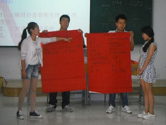 生性与生殖健康教育基地),在C区L楼201教室举办了2015年第三期大学生性与生殖健康知识同伴教育骨干能力拓展培训班。徐明教授对本学期选修《性与生殖健康教育》通识教育选修课程的45名各专业的师范生志愿者,进行了青春期性健康知识、同伴教育理论、艾滋病防治知识及传播知识的系统培训,在整个培训过程中,学员们通过互动和讨论,以及积极健康的游戏活动,不仅获取了知识,而且增强了参与性与生殖健康教育工作的责任和意识。