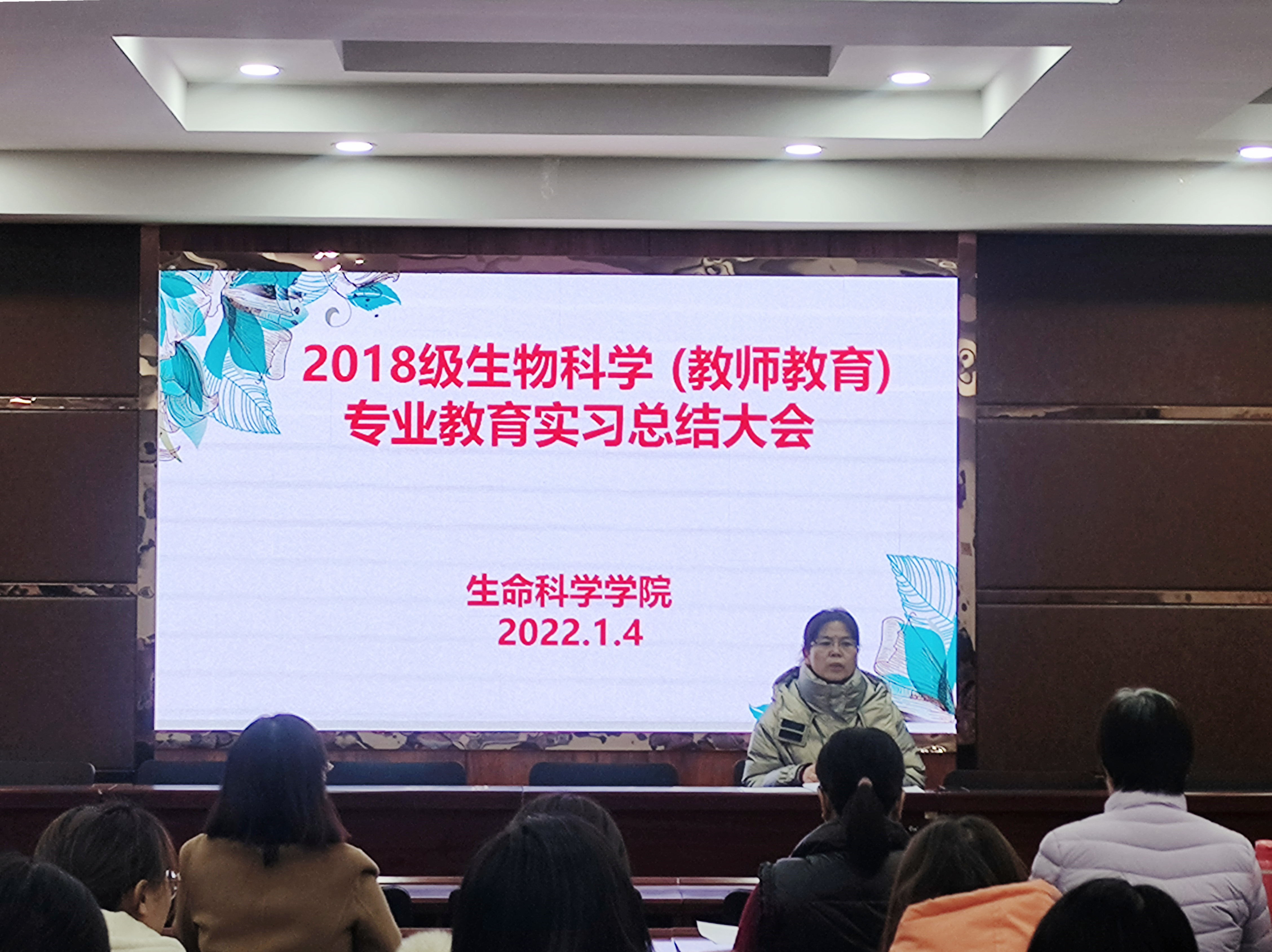 于文萃校区知本楼报告厅召开了2018级教育实习总结大会。全体实习指导教师和2018级生物科学(教师教育)专业学生参加了会议,会议由师范教育教研室主任周续莲主持。