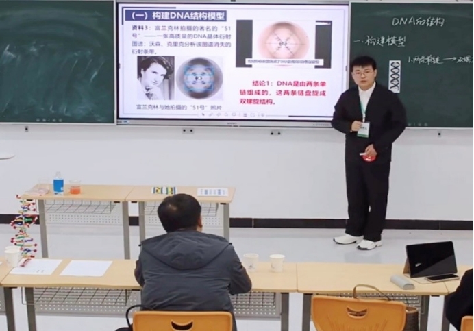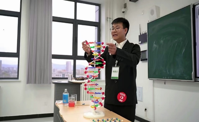 阳震同学以高中生物学必修二教材中“DNA分子的结构”一节为教学内容,凭借扎实的专业知识、先进的新课程理念、自信从容的教态、多元化的教学方法,在激烈的竞争中脱颖而出,体现出扑克游戏 在师范生培养过程中扎实的工作作风,展现了扑克游戏 师范生积极向上、追求卓越的良好精神风貌。