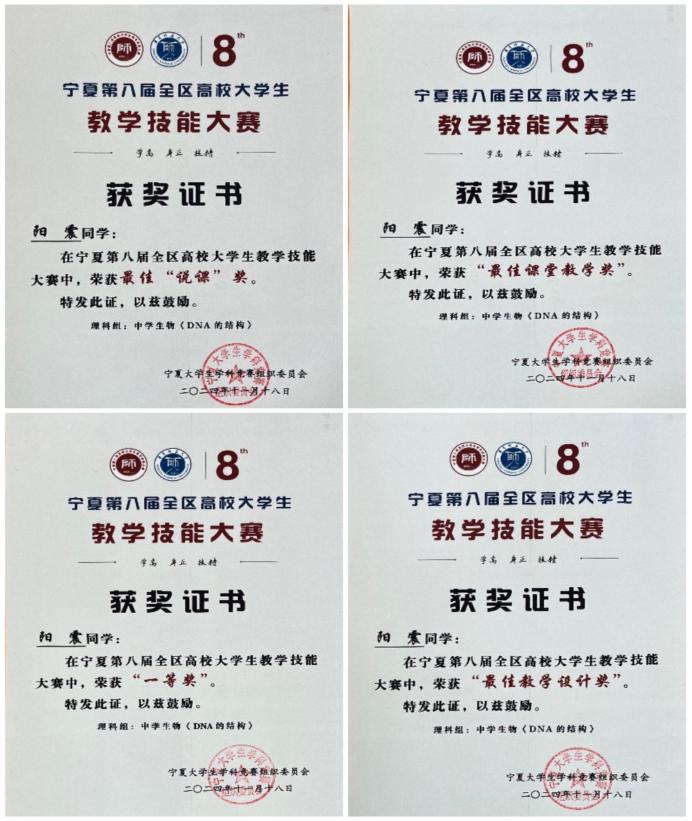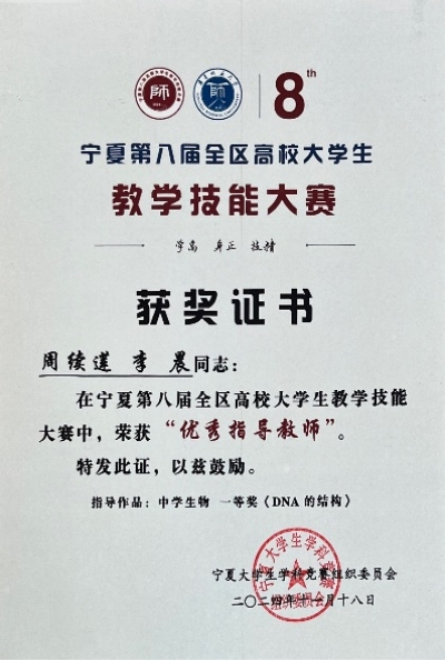 2024年11月16日至17日,由宁夏教育厅主办、宁夏师范大学承办的第八届全区高校大学生教学技能大赛决赛在宁夏师范大学古雁校区举行。来自扑克游戏 、北方民族大学、宁夏医科大学等18所高校的199名学生入围决赛。扑克游戏 2021级生物科学(师范)专业本科生阳震在此次比赛中表现卓越,荣获理科组(中学生物)一等奖,并斩获“最佳教学设计奖”“最佳说课奖”“最佳课堂教学奖”三个单项奖。同时,扑克游戏 师范教育教研室周续莲老师、李晨老师荣获“优秀指导教师”奖。