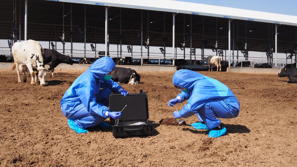 噬菌体研究团队在奶牛养殖场现场采集粪便检测样品。银川电视台记者 宋志书 摄