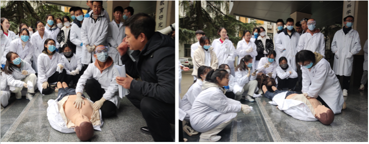 火灾应急疏散完毕之后,工作人员详细讲解了心肺复苏操作步骤及注意事项,并指导师生进行实操演练,不少同学踊跃参与。