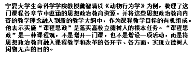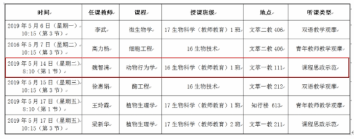 2018-2019学年第二学期期中教学检查听课安排中,《动物行为学》作为课程思政示范课进行了教学观摩活动。所讲内容为“动物的通讯行为”,主要融入了“传统文化、科学探索、创新精神、情感教育和文化传承”等思政元素。