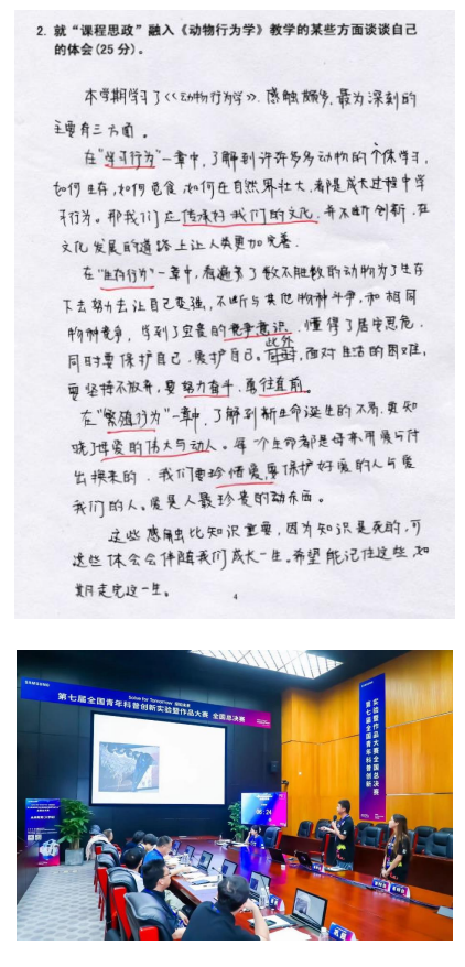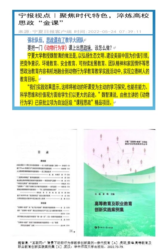 《动物行为学》研究动物在自然条件下的各种行为(本能、学习、生存、繁殖、社群等)。 掌握动物行为学所揭示的规律,不仅能为防治有害动物提供措施和方法,而且会对有益动物 和稀有动物的保护、繁育和合理取用提供科学依据。在教学中,潜移默化的融入思想政治教 育内容,以弘扬生态文明、建设美丽中国为价值引领,把竞争意识、环境教育、安全教育、 挫折教育、审美教育、情感教育、爱的教育、人口教育、可持续发展教育、创造发明教育、 动物福利教育和生命伦理教育、探索精神、雷锋精神、团队精神、家国情怀和文化传承等思 想政治教育内容有机地融合到动物行为学教育教学实践活动之中,在动物行为学知识传授和 能力培养过程中,达成立德树人的教育目标。