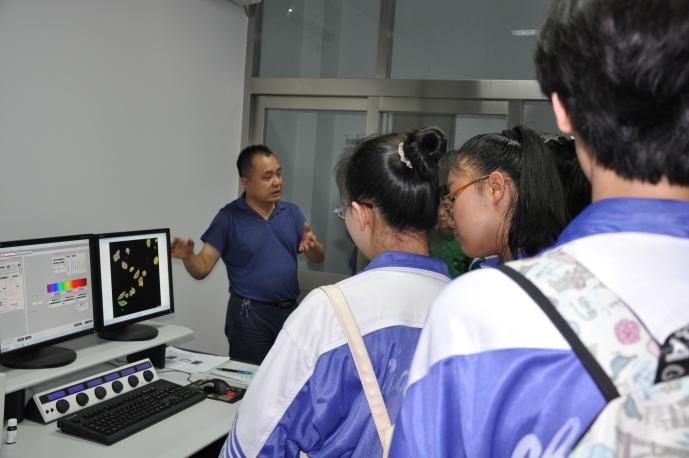 教育部重点实验室副主任邓光存教授首先向同学们介绍了生命科学研究领域及教育部重点实验室的基本情况。随后,在邓主任的带领下,同学们走进虚拟仿真实验室,孙波教授通过向同学们演示虚拟仿真技术模拟真实的工厂实景,让学生如身临其境般走进生产场所进行一系列学习及操作,了解生命科学技术在生产实践中的具体应用,丰富了学生的阅历,拓展了知识视野。在分子细菌学实验室,邓光存教授详细介绍了分子细菌学技术在动物疫病防控中的应用,并现场展示了微生物技术操作过程以及不同类型细菌的形态特征。植物病毒基因工程实验室负责人王盛教授介绍了如何利用新型植物RNA病毒载体表达系统作为植物生物反应器,获得大量成本低廉、安全的目的蛋白。植物基因工程实验室赵帅博士介绍了利用转基因技术培育替代植物杠柳生产天然橡胶工业原料,以及培育名特优花卉新品系等的具体应用。在天然产物分离与纯化实验室,张自萍教授结合宁夏特色植物资源开发与利用,详细介绍了生物化学相关研究技术及天然产物分离与纯化研究领域的前沿进展。仪器中心宋孚洋老师向同学们介绍了流式细胞仪、蛋白质纯化系统、激光共聚焦显微镜等大型仪器设备的使用原理及应用领域。此外,学生们还相继到干细胞培养室以及植物组织培养室进行了参观和学习,了解了动物细胞培养、植物组织培养的方法及过程。